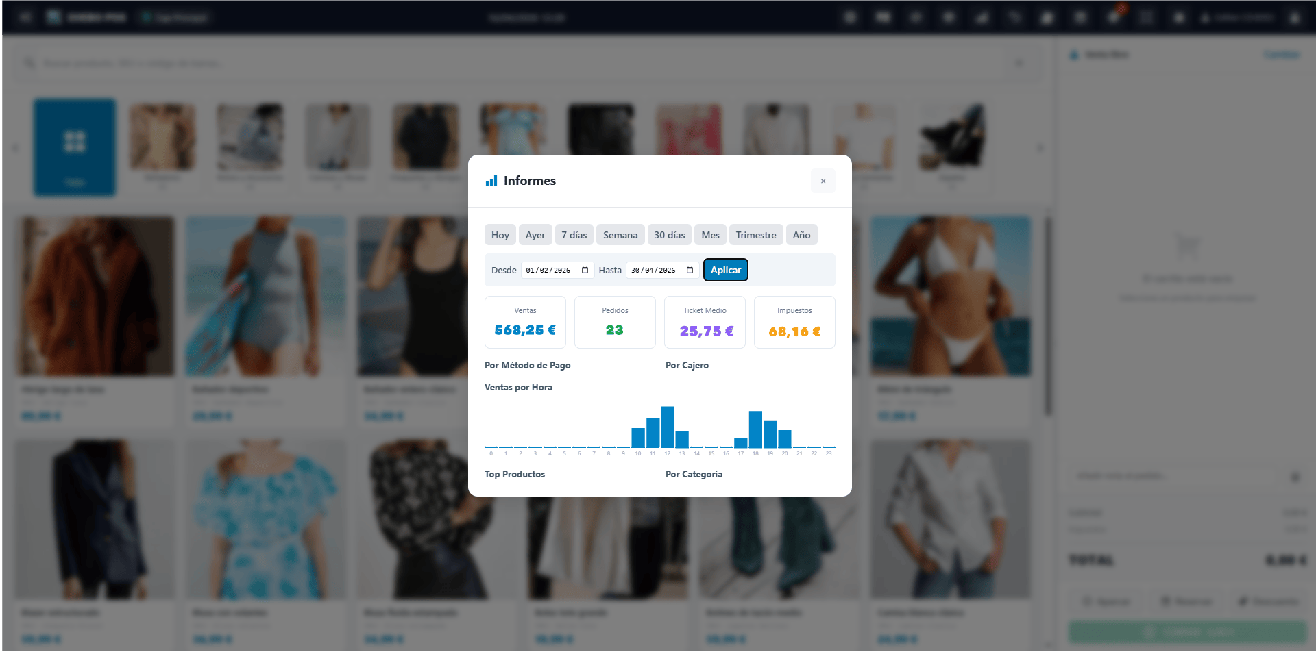 - Informes: Dashboard con estadísticas de ventas, productos más vendidos, rendimiento por cajero